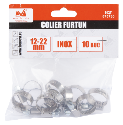 Acest tip de coliere EvoTools este confectionat din inox, conform regulamentului DIN 3017. Banda din inox are o latime de 9 mm si o grosime 0.65 mm. Sunt utilizate pentru articole de de gradinarit si irigare.