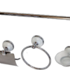6 componente: port prosop inel, cuier de baie, port sapun, port hartie, port pahar simplu, port prosop simplu. Realizate din alama cromata si sticla mata.