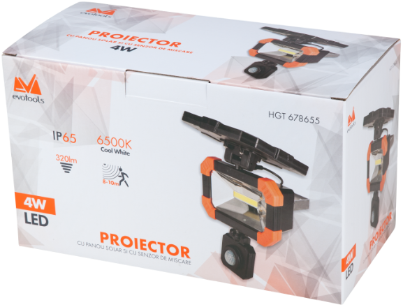 Proiectorul LED cu panou solar este ideal pentru iluminatul exterior, la intrari, fara a fi necesara o sursa de electricitate. Are un grad de protectie IP65 si o constructie rezistenta la intemperii, funtionand astfel indiferent de vreme. Acumulatorul Li-Ion 3.7V / 2000 mAh se incarca in aproximativ 6 ore si alimenteaza becurile de tip led COB cu puterea de 4W. Panoul solar are o putere de 3W. Autonomia acestui proiector este de 2 ore, iluminat continuu, daca este detectata miscare. Timpul de functionare dupa detectia miscarii poate fi reglat intre 10-180 secunde. Intensitatea luminoasa este de 320 lumeni +/- 15%, avand o lumina rece 6500K. Senzorul are un unghi de 110 grade, detectand miscarea de la o distanta de 8-10 m.